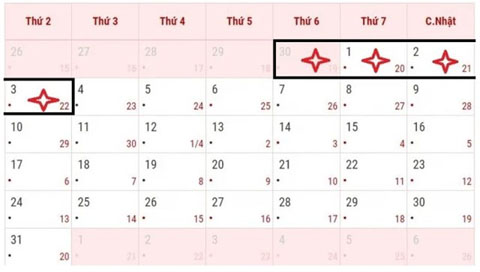 Lịch nghỉ ngày 30/4 và 1/5. Ảnh: Internet.