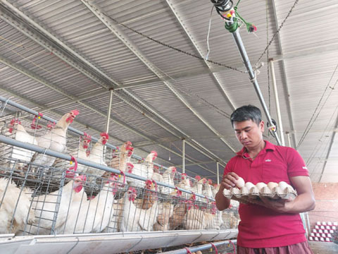 Trang trại gà của gia đình anh Thành có diện tích 500 m2, được chia làm hai dãy chuồng: một dãy chuồng chuyên nuôi gà lồng và một dãy chuồng để nuôi gà hậu bị. Trang trại của anh đang nuôi 2.500 con gà, mỗi ngày anh thu hoạch 2.000 quả trứng. Với giá bán 1.500 - 1.800 đồng/quả, sau khi trừ chi phí, mỗi tháng gia đình anh lãi 15 triệu đồng.