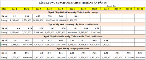 - Ngạch Thư ký trung cấp thi hành án được áp dụng hệ số lương công chức loại B.