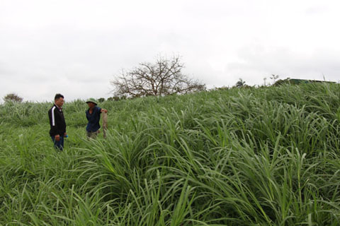 Mô hình trồng cỏ VA 06 của gia đình ông Nguyễn Văn Tuyền (bên phải) thu 45 ngày/lứa, mỗi lứa có năng suất hơn 100 tấn/ha.