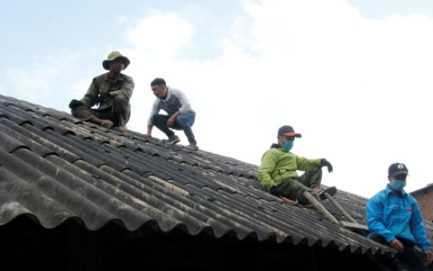 Thanh niên của huyện M'Drắk giúp người dân tháo dỡ mái tôn.