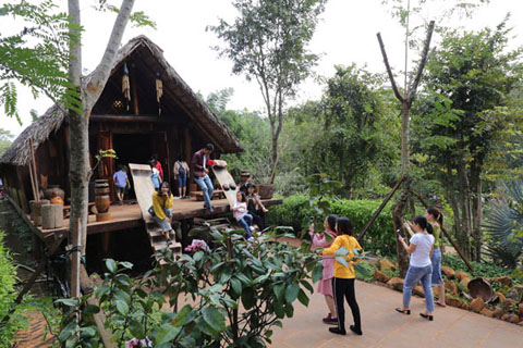 Du khách chụp ảnh lưu niệm tại nhà dài trong Khu du lịch sinh thái Ako Ea (TP. Buôn Ma Thuột). Ảnh: Hoàng Gia