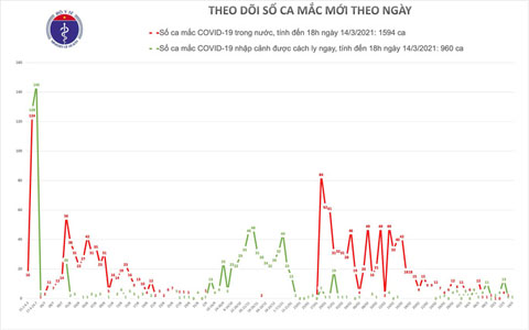 Bộ Y tế sáng 15-3 cho biết 12 giờ qua, Việt Nam không ghi nhận thêm ca mắc mới, tổng số ca ở nước ta vẫn là 2.554. Trong số này, có tổng cộng 1.594 ca mắc Covid-19 do lây nhiễm trong nước, trong đó số lượng ca mắc mới tính từ ngày 27-1 đến nay là 901 ca. Tổng số ca khỏi bệnh ở nước ta là 2.086 người. Nước ta cũng ghi nhận 35 ca tử vong.