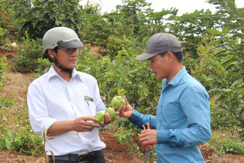 Anh Nguyễn Văn Dần (bên phải) ở buôn Cư Yuck (xã Cư Pơng) giới thiệu giống ổi Đài Loan