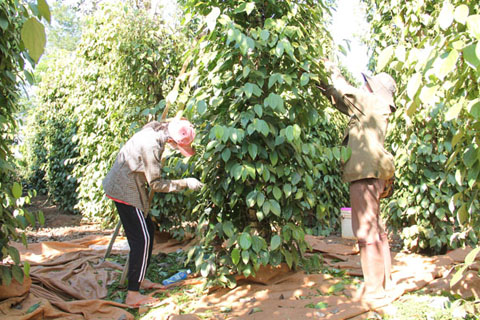Nông dân ở xã Tân Lập (huyện Krông Búk) thu hoạch tiêu.