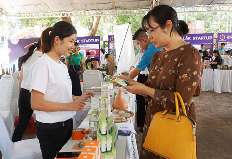 Du khách tham quan gian hàng trưng bày các sản phẩm khởi nghiệp tại Ngày hội khởi nghiệp tỉnh Đắk Lắk năm 2020