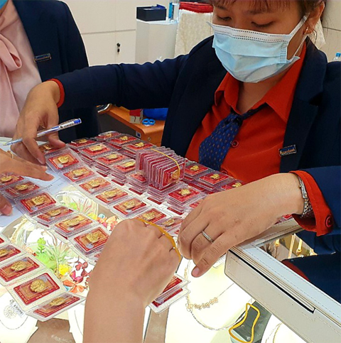 Ở thị trường vàng trong nước, giá vàng SJC cuối ngày được giao dịch quanh 54,45 triệu đồng/lượng mua vào, bán ra 54,85 triệu đồng/lượng, cao hơn giá thế giới tới 7,8 triệu đồng/lượng.