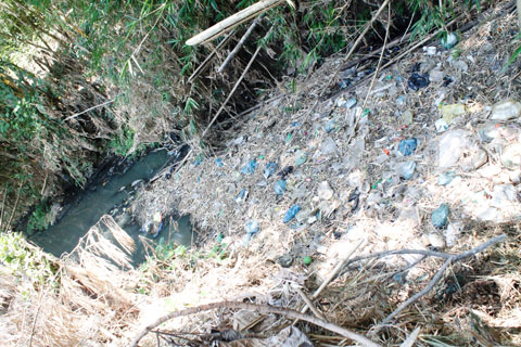 Một đoạn trên dòng suối Đốc Học bị ô nhiễm do chất thải từ chăn nuôi và rác thải sinh hoạt của người dân.