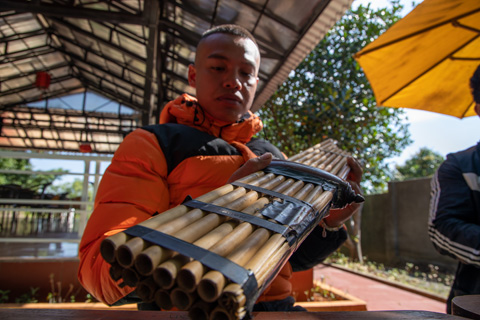 Nhạc cụ khaen bị vỡ, thành viên của đội phải dán băng keo để dùng tạm