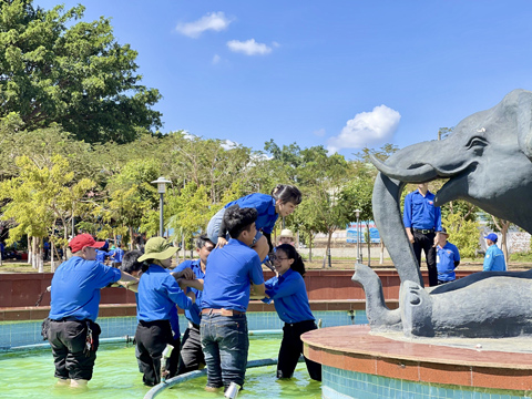 Đoàn viên thanh niên thể hiện tinh thần đoàn kết qua các trò chơi vận động.