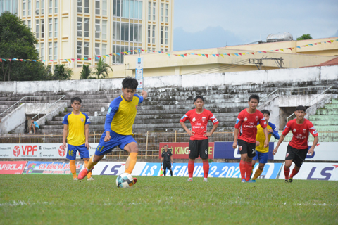 Trận đấu giữa Câu lạc bộ bóng đá Đắk Lắk (áo vàng) và Long An ở mùa giải 2020