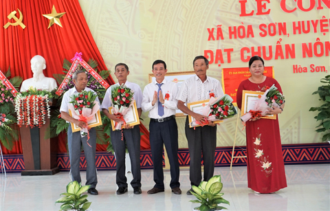 Tại buổi lễ, Giám đốc Sở Lao động – Thương binh và Xã hội Trần Phú Hùng trao Bằng công nhận NTM, Cờ thi đua và phần thưởng 1 tỷ đồng (dùng xây công trình phúc lợi) của UBND tỉnh cho xã Hòa Sơn. UBND huyện Krông Bông tặng Giấy khen 4 tập thể, 6 cá nhân, 1 hộ gia đình; UBND xã Hòa Sơn tặng Giấy khen cho 8 tập thể, 9 cá nhân có thành tích xuất sắc trong thực hiện xây dựng NTM.