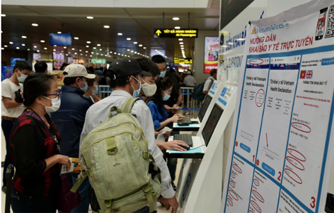 Đoàn thanh niên sân bay quốc tế Nội Bài hỗ trợ khách khai báo y tế - Ảnh: Phan Công
