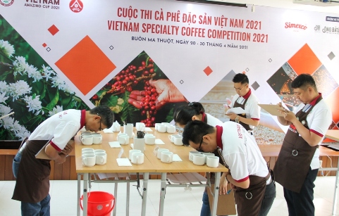 Ban giám khảo đang chấm điểm các mẫu cà phê dự thi tại Cuộc thi Cà phê đặc sản Việt Nam năm 2021