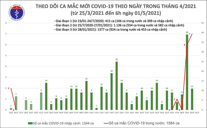 Bộ Y tế sáng 1-5 cho biết 12 giờ qua, Việt Nam không ghi nhận ca mắc mới Covid-19, tổng số bệnh nhân ở nước ta hiện là 2.928 người. Trong số này có tổng cộng 1.584 ca mắc Covid-19 do lây nhiễm trong nước.