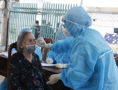 Cán bộ Trung tâm Kiểm soát bệnh tật tỉnh lẫy mẫu xét nghiệm SARS-CoV-2 đối với những người dân trong khu vực phong tỏa tại hẻm 189/1 Mai Hắc Đế do có liên quan đến 2 ca bệnh COVID-19 là BN3237 và BN3334