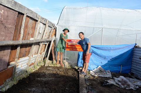 Anh Trương Đăng Hưng trồng xen cỏ vetiver trong vườn cây ăn trái tại thị trấn Ea Pốk, huyện Cư M’gar.