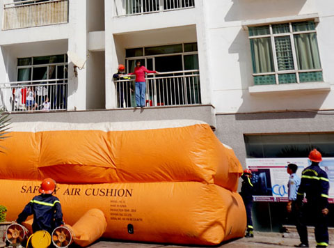 Thực tập thoát hiểm khi xảy ra hỏa hoạn cho cư dân ở Khu chung cư Hoàng Anh Gia Lai, TP. Buôn Ma Thuột.