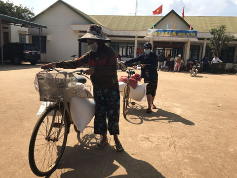 Người dân xã Ea Hiu (huyện Krông Pắc) nhận gạo hỗ trợ mùa giáp hạt.