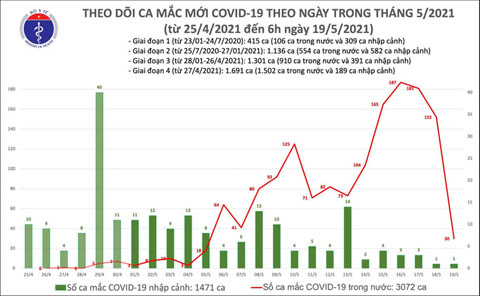 Bộ Y tế sáng 19-5 cho biết nước ta ghi nhận thêm 31 ca mắc mới Covid-19 (BN4513-4543 ), trong đó 1 ca cách ly ngay sau khi nhập cảnh tại TP HCM và 30 ca mắc ghi nhận trong nước tại Bắc Ninh (16), Bắc Giang (10), Lạng Sơn (3), TP HCM (1). Thông tin chi tiết các ca mắc mới: