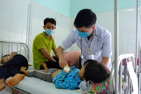 Bác sĩ điều trị cho một bé gái nghi bị ngộ độc sau khi ăn đám cưới tại xã Quảng Hòa (Đắk Glong, Đắk Nông) - Ảnh: ĐÌNH CƯƠNG