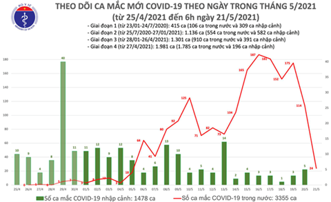 Bản tin sáng 21/5 của Bộ Y tế cho biết có thêm 24 ca mắc Covid-19 trong nước ghi nhận tại Bắc Giang, Điện Biên, Hải Dương và Bắc Ninh. Việt Nam hiện có 4.833 bệnh nhân