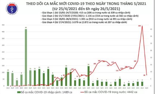 Sáng 26-5, Bộ Y tế cho biết nước ta phát hiện thêm 80 ca mắc mới Covid-19 (BN5852-5931) ở trong nước tại Bắc Giang (55), Bắc Ninh (23), Thanh Hóa (1), Hải Dương (1).