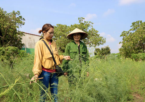Cán bộ Hội Nông dân xã Cư M'gar (bên trái) tham quan mô hình trồng măng tây của gia đình bà Hà Thị Hinh (thôn 5)
