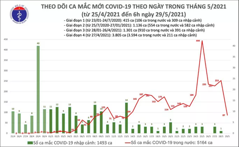 Sáng 29-5, Bộ Y tế cho biết trong 12 giờ qua, nước ta ghi nhận thêm 87 ca mắc mới Covid-19 (BN6571-6657) là các ca bệnh trong nước tại Bắc Giang (57), Bắc Ninh (27), Bạc Liêu (1), Gia Lai (1) và Bệnh viện K cơ sở Tân Triều (1).