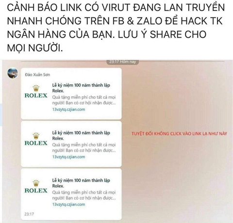 Cộng đồng mạng đang cảnh báo nguy cơ dính virus và mất tài khoản khi bấm vào link quảng cáo trúng thưởng đồng hồ Rolex
