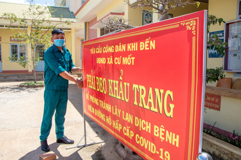 Biển khẩu hiệu "Phải đeo khẩu trang" được đặt khu vực sân UBND xã Cư Mốt.