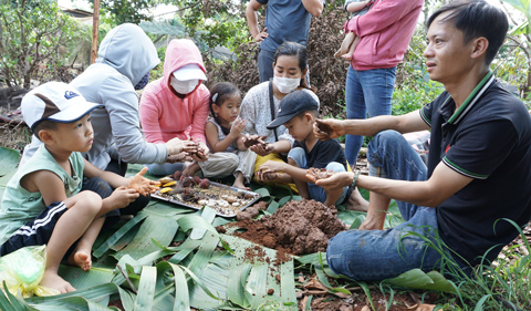 Anh Phạm Quang Thái (bìa phải) hướng dẫn các em thiếu nhi cách làm "bom hạt giống".