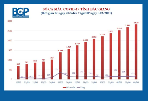 Ban chỉ đạo phòng chống dịch tỉnh Bắc Giang cho biết đến 19 giờ ngày 3-6, trên địa bàn tỉnh Bắc Giang còn 2 ổ dịch Covid-19 vẫn phát sinh thêm ca dương tính SARS-CoV-2 (F0) mới. Tổng số trường hợp F0 là 2.828 người (tăng 145 người trong 24 giờ qua); F1 là 18.662 trường hợp; F2 là 82.262 trường hợp.