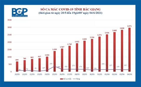 Ban chỉ đạo phòng chống dịch tỉnh Bắc Giang cho biết đến 19 giờ ngày 4-6, tổng số trường hợp F0 (ca dương tính SARS-CoV-2) trên địa bàn là 2.971 trường hợp (tăng 143 trường hợp trong 24 giờ qua); F1 là 18.909 trường hợp; F2 là 85.317 trường hợp.