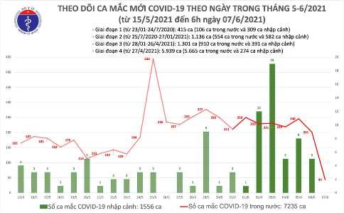 Đến nay, tổng số ca mắc Covid-19 ở nước ta là 8.791 trong đó 7.235 ca ghi nhận trong nước và 1.556 ca nhập cảnh. Đợt dịch thứ 4 kể từ ngày 27-4 đến nay nước ta đã phát hiện 5.656 ca mắc tại 38 tỉnh, thành phố. Nước ta đã điều trị khỏi 3.368 bệnh nhân Covid-19. Số ca tử vong liên quan đến Covid-19 hiện là 53.