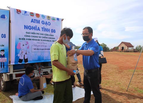 Người dân huyện Krông Búk nhận gạo từ chương trình "ATM Gạo nghĩa tình" năm 2020.