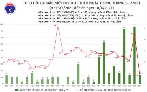 Bộ Y tế cho biết sáng 10-6 nước ta ghi nhận thêm 70 ca mắc Covid-19 (BN9566-9635) trong đó 4 ca cách ly ngay sau khi nhập cảnh tại Long An và 66 ca ghi nhận trong nước tại: TP HCM (26), Bắc Ninh (23), Bắc Giang (16), Hà Tĩnh (1); trong đó 50 ca được phát hiện trong khu cách ly hoặc khu đã được phong toả.