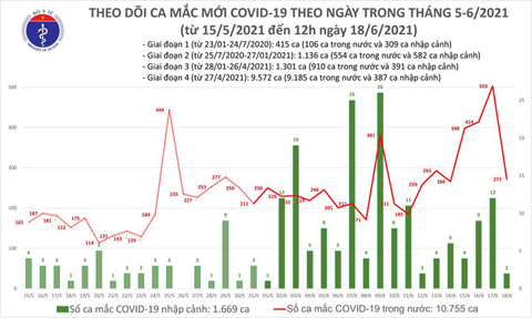 Bộ Y tế trưa18-6 cho biết trong 6 giờ qua cả nước ghi nhận thêm 121 ca mắc Covid-19 (BN12232-12424) trong đó 2 ca cách ly ngay sau khi nhập cảnh tại Đồng Tháp (1), Thái Nguyên (1) và 119 ca ghi nhận trong nước tại TP HCM (59), Bắc Giang (36), Bình Dương (12), Bắc Ninh (10), Hòa Bình (1), Lào Cai (1); trong đó 110 ca được phát hiện trong khu cách ly hoặc khu đã được phong toả.