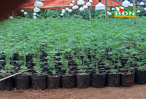 Tại hiện trường, lực lượng Công an đã lập biên bản, thu giữ 2.613 cây cần sa có chiều cao từ 40 đến 70cm được trồng trong các chậu nhựa, xếp thành 19 luống và trang bị hệ thống đèn chiếu sáng để kích thích sự phát triển của cây. Kiểm tra hiện trường, lực lượng Công an thu giữ khoảng 2,2 kg (nghi lá cây cần sa tươi) và 1 bịch nilon bên trong đựng hoa quả khô (nghi hoa quả cây cần sa)...