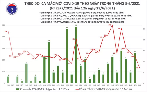 - 2 CA BỆNH (BN13789-BN13790) ghi nhận tại tỉnh Lào Cai: là F1 của BN12255, BN12540, đã được cách ly từ trước. Kết quả xét nghiệm lần 3 ngày 23-6 dương tính với SARS-CoV-2. Hiện đang cách ly, điều trị tại Bệnh viện Đa khoa tỉnh Lào Cai.