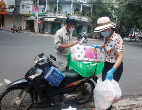 Chị Nguyễn Thị Vân Anh "tiếp tế" cho các hộ dân khu vực phong tỏa trên đường Hoàng Diệu tháng 8-2020