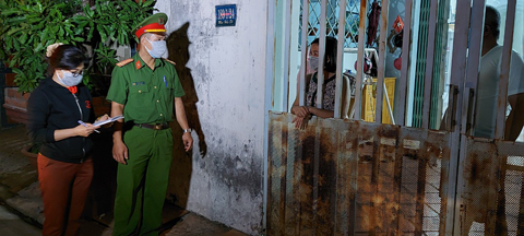 Khoảng 21 giờ đêm 8-5, sau khi cán bộ y tế tiến hành phun khử khuẩn toàn bộ con hẻm, chúng tôi chú ý đến hình ảnh người phụ nữ mặc áo khoác đen, cầm theo quyển sổ, cây viết đi từng ngõ, gõ từng nhà để thu thập thông tin cung cấp cho địa phương và cơ quan y tế.