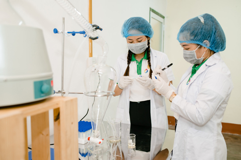 Chị Tống Thị Hoài Phương (bên phải) đang điều chế tinh dầu