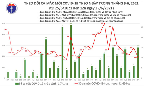 - 18 CA BỆNH (BN14349-BN14362, BN14365-BN14367, BN14369) ghi nhận tại tỉnh Bắc Giang trong khu cách ly và khu vực đã được phong tỏa, liên quan đến nơi lưu trú của công nhân làm việc tại các khu công nghiệp. Kết quả xét nghiệm ngày 24-6 dương tính với SARS-CoV-2.