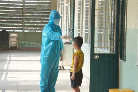 Nhân viên y tế tại Khu cách ly TP Thủ Đức, TP HCM (Khu cách ly Trung tâm quận 2 trước đây) kiểm tra thân nhiệt người cách ly. (Ảnh: HẢI YẾN)