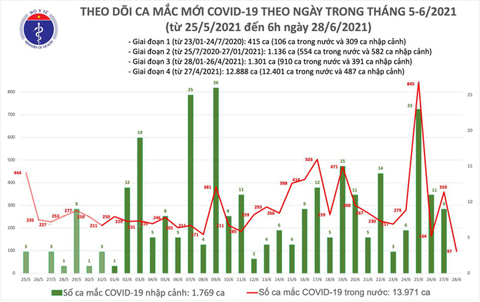 - 4 CA BỆNH (BN15648-BN15651) ghi nhận tại tỉnh Bắc Ninh: 2 ca liên quan đến ổ dịch Khu 4 - Tiền An, 1 ca liên quan đến ổ dịch Khu công nghiệp Quế Võ, 1 ca liên quan đến ổ dịch Khắc Niệm. Kết quả xét nghiệm ngày 26 và 27-6 dương tính với SARS-CoV-2.