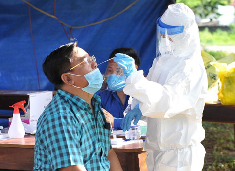 Nhân viên y tế lấy mẫu xét nghiệm SARS-CoV-2 cho người điều khiển phương tiện tại một chốt kiểm soát phòng, chống dịch COVID-19 trên địa bàn tỉnh