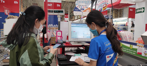 Khách hàng thanh toán bằng ví điện tử Momo tại quầy thu ngân của Siêu thị MM Mega Buôn Ma Thuột