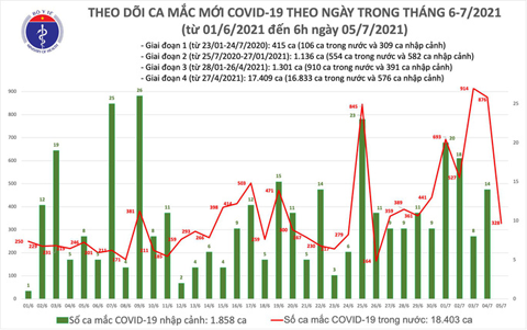 Bộ Y tế sáng 5-7 cho biết trong 12 giờ qua, cả nước ghi nhận thêm 328 ca mắc Covid-19 (BN19934-20261) đều là ca bệnh trong nước tại TP HCM (175), Đồng Tháp (100), Phú Yên (23), Hưng Yên (9), Khánh Hòa (8), An Giang (6), Long An (2), Bắc Ninh (2), Lạng Sơn (1), Đồng Nai (1), Sóc Trăng (1); trong đó 272 ca được phát hiện trong khu cách ly hoặc khu đã được phong toả.