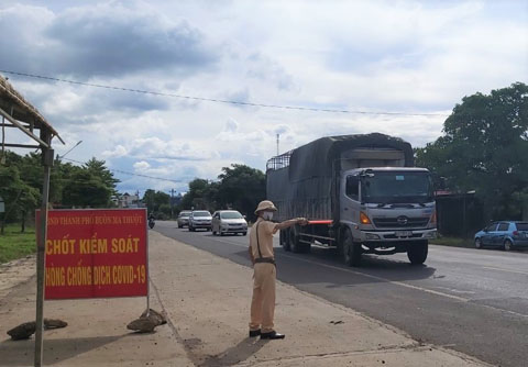 Tất cả các xe từ tỉnh ngoài vào Đắk Lắk đều nhận được hiệu lệnh dừng xe vào khai báo y tế từ lực lượng Cảnh sát giao thông trực tại chốt.